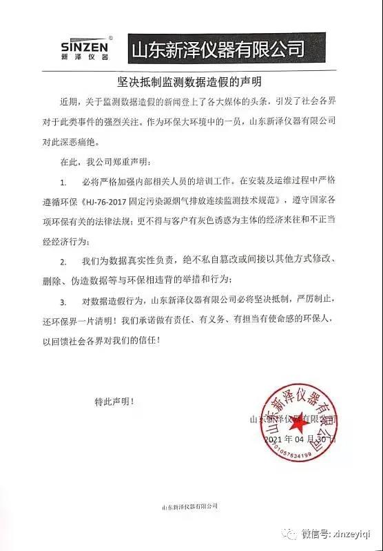 山東新澤堅決抵制監測數據造假的聲明
